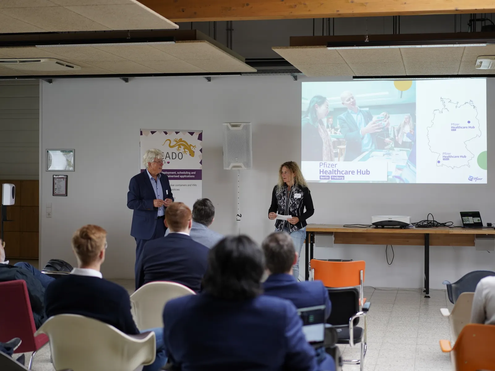 Speakers included Robert Lovas from SZTAKI, Institute for Computer Science and Control, Hans Zebner from Pfizer Healthcare Hub, Dr. Christian Haverkamp from the Institute of Digitalization in Medicine (Universitätsklinikum Freiburg), Sebastian Pena Serna, founder of clesgo, Professor Christian Klaes from Ruhr University Bochum, Saskia Wagner-Sardesai and Michael Dominik Görtz from Fraunhofer IML, Giuseppe Conti from WITA, Andreas Ocklenburg and Liza Ocklenburg from cloudSME - Cloud Architects and Alberto Landini from STAM S.r.l.