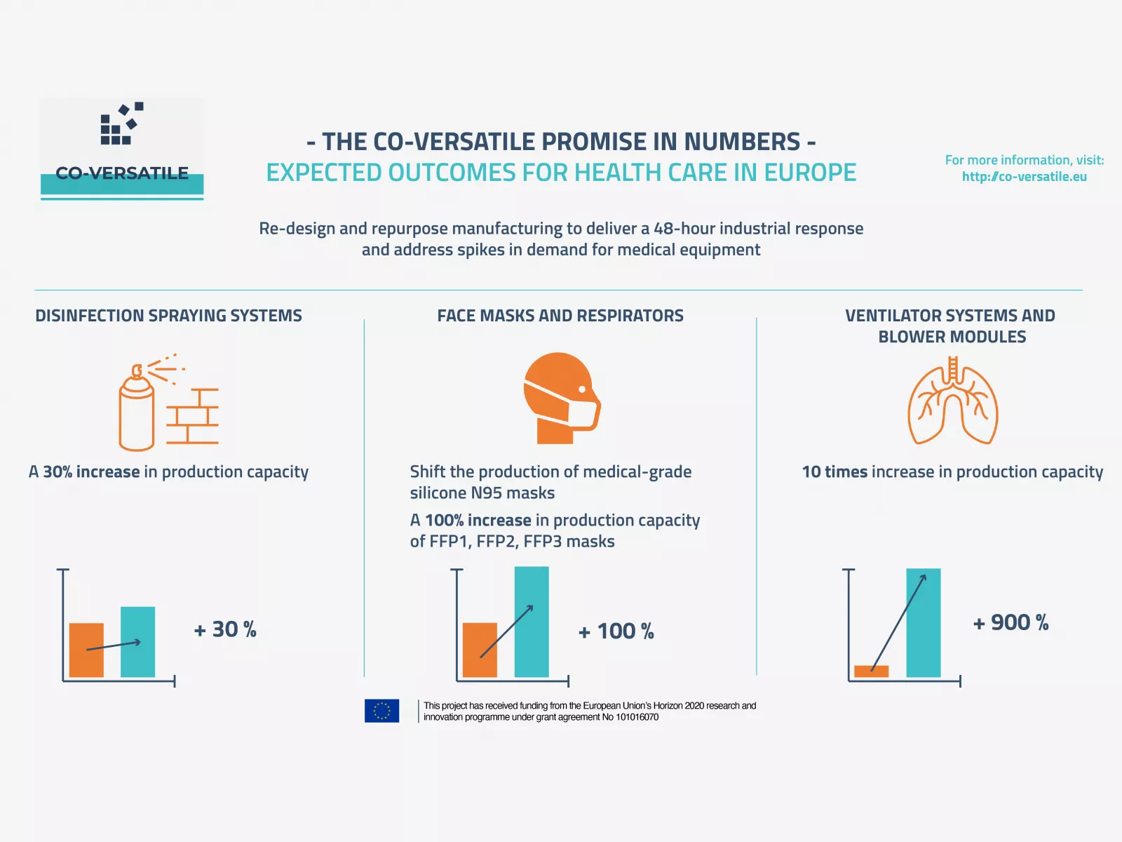 CO-VERSATILE builds upon current and past industry-driven research and innovation initiatives to deliver a flexible 48-hour industrial response and address sudden spikes in demand for strategic medical products. CO-VERSATILE expected outcomes for healthcare provisioning in Europe include a significant increase in production capacity of: